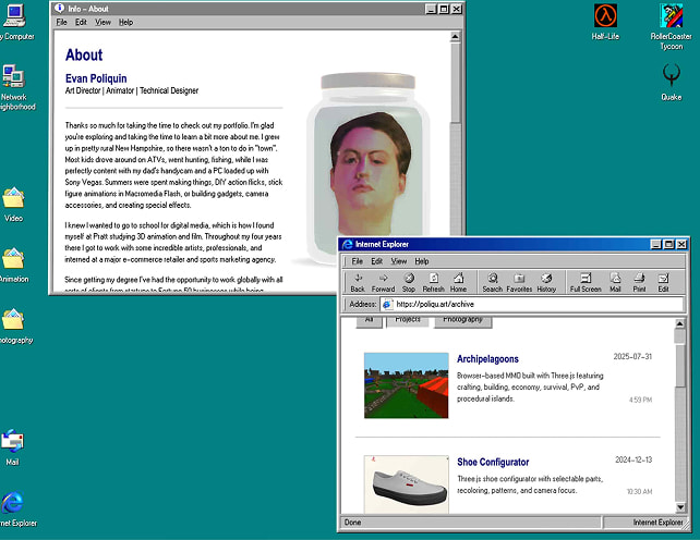 The attention to detail alone in this win98 inspired portfolio makes it worth checking out. Quake clone, minesweeper, sound effects - really fun.